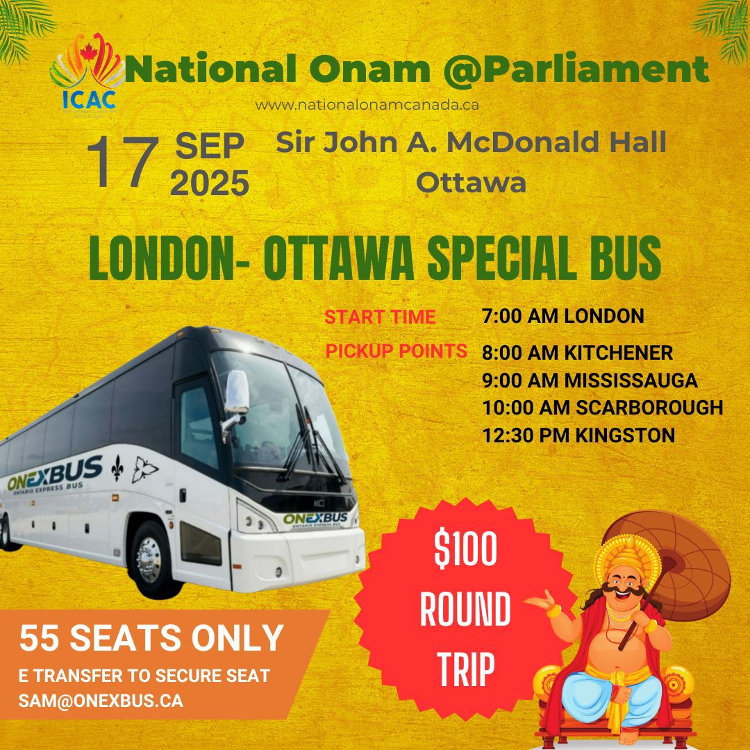 Dear Passengers,   Please find below the travel plan and pick-up locations, arranged for everyone’s convenience.   Departure: Location: London Date: Wednesday, September 17 Time: 7:00 AM Address: 4530 Wellington Road South, London, N6E 2Z6 (McDonald’s)   Pick-Up Points:  • Kitchener Time: 8:00 AM Address: Sportsworld Station, N2P 0A5  • Mississauga Time: 9:00 AM Address: 1325 Eglinton Ave East, L4W 4L9 (Coconut Grove Foods)  • Scarborough Time: 10:00 AM Address: 2021 Kennedy Road, M1P 2M1 (Kennedy Commons Shopping Mall Parking Lot)  • Kingston Time: 12:30 PM Address: 1586 Centennial Dr, Kingston, K7P 0C7 (Petro-Canada Station)  • Ottawa (McNabb Recreation Centre) Time: 3:00 PM Address: 180 Percy St, Ottawa, K1R 6E5   Additional Information:  • Lunch will be served upon arrival, followed by 2 hours to refresh and change.  • Separate changing areas will be available for men and women.  • Departure to the Onam venue: between 4:30 PM – 5:00 PM.  • 30–45 minutes will be available for sightseeing and photos.  • Venue check-in: 5:30 PM.   Return:  • Departure from Ottawa at 9:30PM.